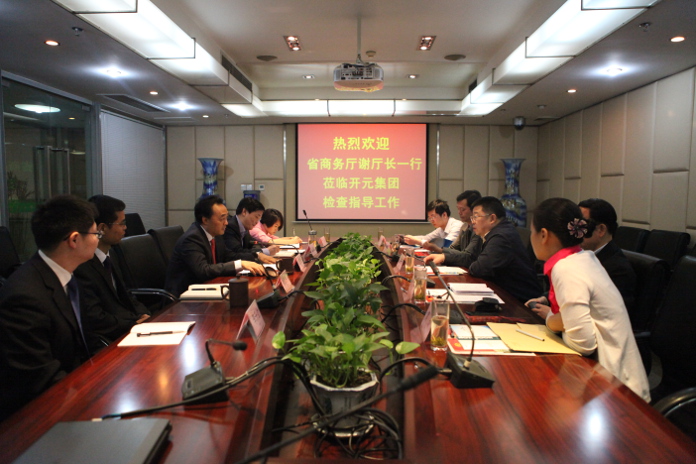首先,趙董事長(zhǎng)對(duì)謝廳長(zhǎng)一行的來(lái)訪表示了熱烈歡迎,并感謝省商務(wù)廳一直以來(lái)對(duì)開(kāi)元集團(tuán)的支持與政策指導(dǎo)。緊接著,趙董事長(zhǎng)就集團(tuán)各個(gè)業(yè)務(wù)板塊的發(fā)展情況向謝廳長(zhǎng)作了全面詳實(shí)的報(bào)告,重點(diǎn)介紹了集團(tuán)境外投資的情況,他指出,開(kāi)元集團(tuán)是四川省“走出去”的代表企業(yè),在老撾、緬甸、加拿大都有投資項(xiàng)目或意向,特別是老撾鉀鹽礦項(xiàng)目,目前已實(shí)現(xiàn)一期投產(chǎn),二期工程建設(shè)也已全面啟動(dòng)。針對(duì)老撾項(xiàng)目,希望省商務(wù)廳給予更多的政策與資金支持。